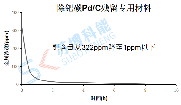 加入寧波蘇博科能少量吸附材料進(jìn)行攪拌過濾,3h后能將鈀殘留降低到10ppm以下,攪拌6h將鈀殘留從322ppm降低到1ppm以下。